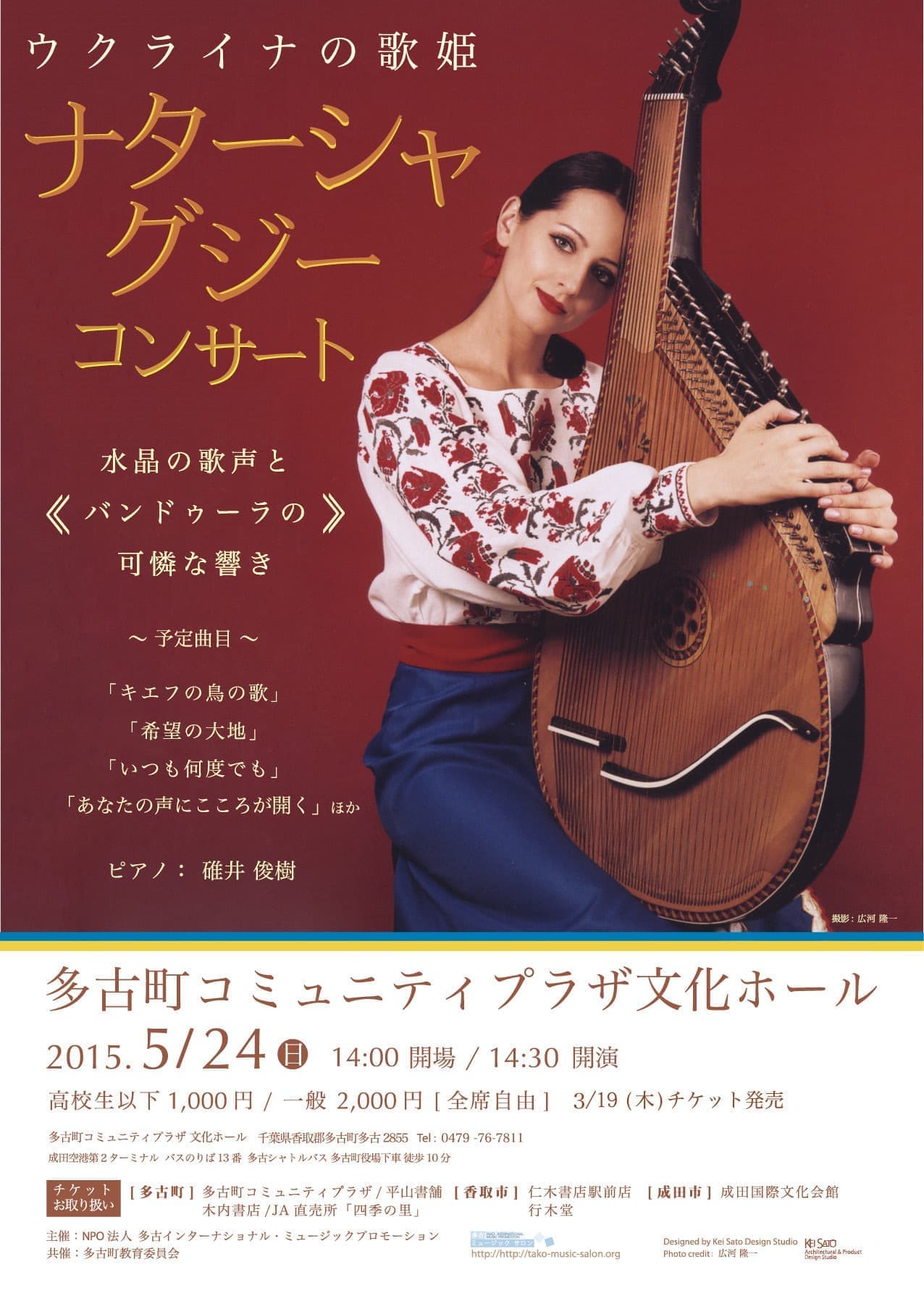 多古ミュージックサロン第6回目となる春のコンサートが5月24日(日)に行われました。今回のゲストは、ウクライナの伝統楽器、バンドゥーラを奏でながら「水晶の歌声」と称される美しい声で聴衆を魅了するナターシャ・グジーさんです。