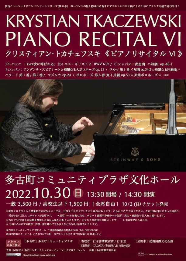 コロナ禍で2年間、来日が叶わなかったポーランド人ピアニスト、クリスティアン・トカチェフスキー氏が、ようやく多古町に来訪し、熱い演奏を披露して下さいました。