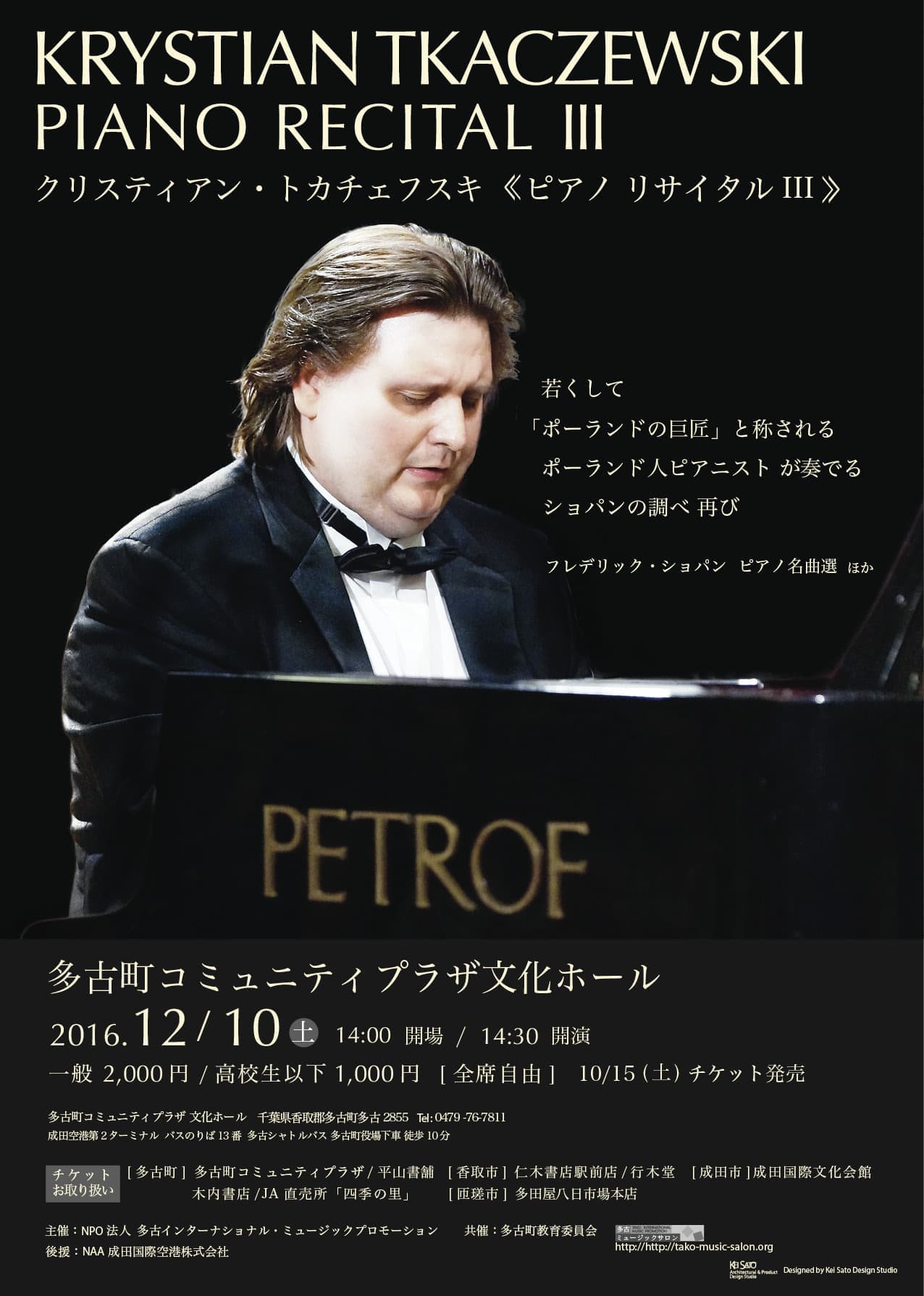 多古ミュージックサロン第11回目となる冬のコンサートは、12月10日(土)、ポーランド人ピアニスト、クリスティアン・トカチェフスキ氏による多古町で3回目となるピアノコンサートです。