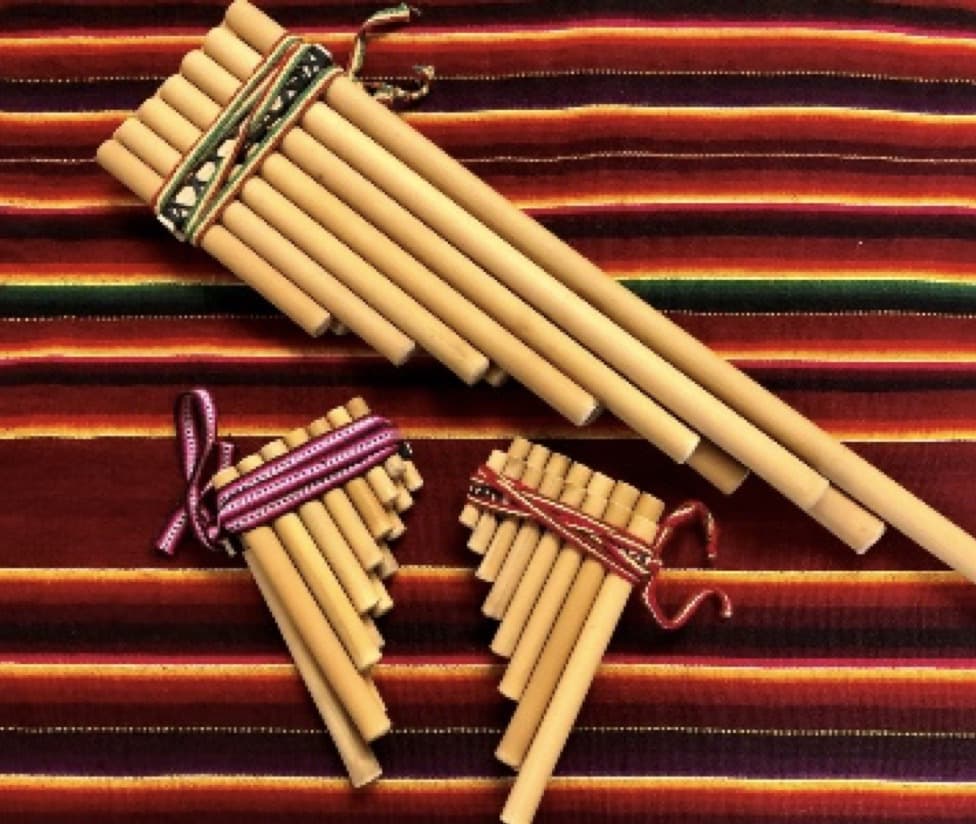 インカ以前の古い文化の時代から人々に吹き継がれてきたのが「ビエントス= 風」と呼ばれるに相応しい音色を持つサンポーニャです。カーニャという芦を節から切り、長さの異なる管を音階順に並べた、素朴な楽器です。このようなパンパイプ(ギリシア神話の牧神パンの笛)は世界各地にありますが、一方をド・ミ・ソ、もう一方をレ・ファ・ラ...と2列に分けて、2人1組でひとつの曲を吹くという奏法は、アンデス音楽独特のものです。標準的なサイズで大半の曲は演奏できますが、小さなサイズの高音用や中低音用、低音用などを加えると、厚みのある合奏をすることができます。