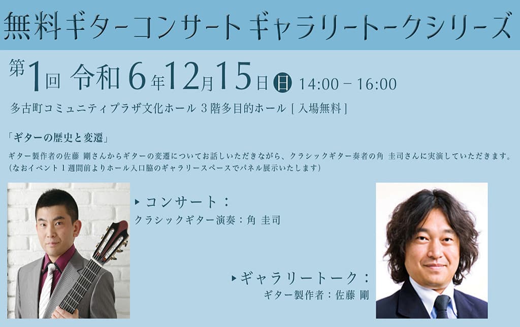 佐藤氏が実際に製作した複数のギターについて紹介しながら、これらを実際に演奏していただき音の違いやその歴史、背景についてお話しいただきます。なおコンサートに先立ち、コミュニプラザ入口横において5日間、ギターの歴史や製作工程についてのパネル展示を行います。(パネルは当日も展示)